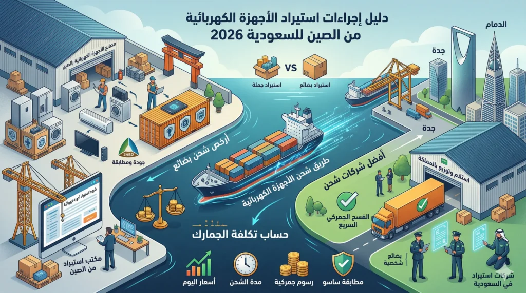 تتطلب إجراءات استيراد الأجهزة الكهربائية من الصين للسعودية دقة متناهية في التعامل مع المواصفات الفنية لضمان مطابقة المنتجات لمعايير هيئة المواصفات والمقاييس والجودة السعودية، نحن في “الصين إليك” نوضح لك أن نجاح تنفيذ إجراءات استيراد الأجهزة الكهربائية من الصين للسعودية يبدأ من الإطلاع على دليل الاستيراد من الصين 2026 الشامل لتجنب رفض الشحنات عند الوصول للموانئ إن الالتزام الصارم بـ إجراءات استيراد الأجهزة الكهربائية من الصين للسعودية يضمن لك ممارسة تجارية آمنة ومربحة بعيداً عن المخاطر القانونية هذا التميز في التخطيط يجنبك الكثير من مشاكل الاستيراد من الصين الشائعة في قطاع الإلكترونيات المعقد الذي يتطلب شهادات مطابقة فنية دقيقة للغاية لضمان سلامة المستهلك النهائي في المملكة