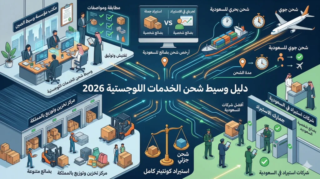 يعتبر دور وسيط شحن الخدمات اللوجستية هو حجر الزاوية في تيسير حركة التجارة العالمية وضمان وصول البضائع من المصنع إلى المستهلك النهائي بكفاءة حالياً ، نحن في “الصين إليك” نساعدك في فهم متطلبات وسيط شحن الخدمات اللوجستية عبر الإطلاع على دليل الاستيراد من الصين للسعودية المحدث لعام 2026 لضمان التأسيس الصحيح إن الحصول على رخصة رسمية يضمن لك الالتزام بكافة القوانين هذا التطور يهدف لتعزيز مكانة المملكة كمركز عالمي رائد